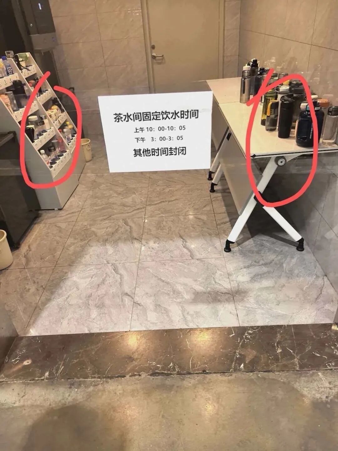 此外,该网友还在评论区晒出另一张照片,内容是该公司此前张贴的 “茶水间固定饮水时间”通知,当时仅允许上下午各一个时段饮水,总计十分钟,规定明确标注:上午10:00-10:05;下午3:00-3:05,其他时间封闭。”评论区不少网友表示惊讶。